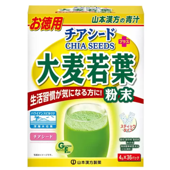 品名 Yamamoto Kanpoh 山本漢方 日本大麥若葉粉末 + 奇亞籽 144公克(4公克 X 36包)