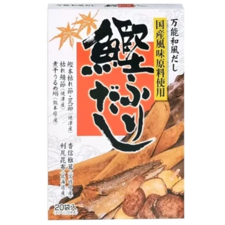 成分 食鹽、砂糖、鰹節魚粉末、沙丁魚粉末、鯖節魚粉末、鰹節魚高湯顆粒(食鹽、砂糖、玉米澱粉、洋蔥粉末、鰹節魚粉末、酵母萃取物、大豆水解蛋白、L-麩酸鈉、5’-次黃嘌呤核苷磷酸二鈉、5’-鳥嘌呤核苷磷酸二鈉、琥珀酸二鈉)、醬油粉末(糊精、醬油、食鹽、砂糖)、香菇粉末、昆布粒、油菜籽油、調未劑(L-麩酸鈉、5’-次黃嘌呤核苷磷酸二鈉、5’-鳥嘌呤核苷磷酸二鈉、琥珀酸二鈉)、乳酸鈣。