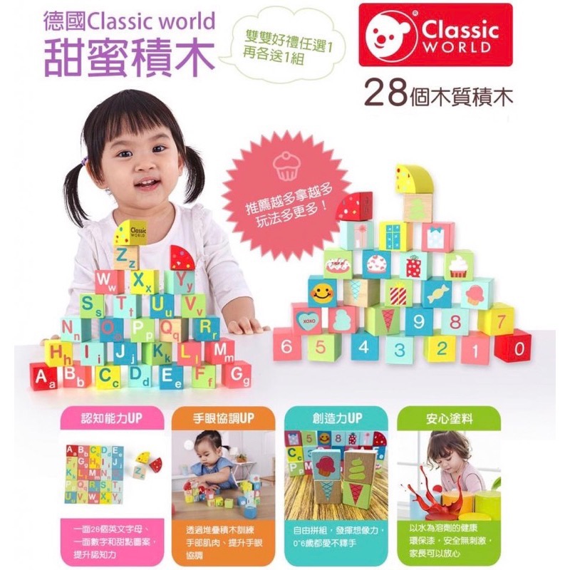 現貨 全新 德國 Classic world 客來喜 甜蜜積木 木製 積木 木製積木 共28個積木 英文 數字 巧虎