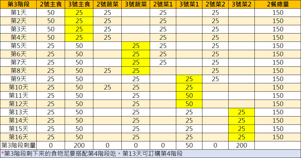 「第3階段」為2號餐1套+3號餐2套共18盒,1盒150g ( 25g X 6顆食物泥冰磚 )