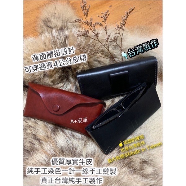 台灣設計開版,優質硬挺牛皮,純手工染色一針一線台灣純手工縫製,使用蠟線縫製超耐用,裡面貼內裡保護眼鏡,基本防壓,超有質感的台灣純手工皮件。
