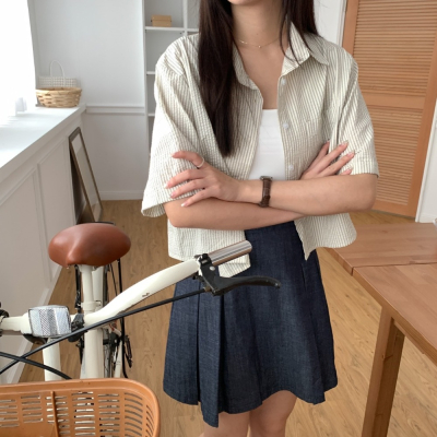 名稱:Beforesunrise-泡泡紗質條紋短袖襯衫(2Colors)