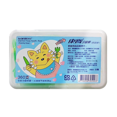 ✔全家牙齒保健~從康寶牙線棒開始 ✔可隨手清除牙縫間之殘渣,防止細菌繁殖,避免牙周病及蛀牙發生。 ➤規格:360支 ➤成分:聚脂纖維線+聚苯乙烯牙籤棒  ➤產地:台灣 ➤保存期限:10年 ✘請置於陰涼通風處,避免陽光長時間曝曬,請勿長時間置於潮濕處,及勿給孩童自行取用。
