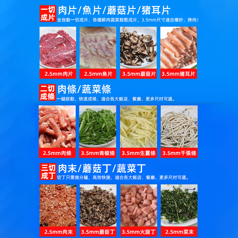 切肉機:主要切肉類為主,一般常用刀距為3.5毫米,機器刀距不能調節,使用前先根據購買機器的型號,把肉塊切成機器可以加工的肉塊大小,放進機器.一次切片/二次切絲/三次切丁.蔬菜類:可切軟質蔬菜,如辣椒,香菇,木耳等/太大需切小塊不可以切土豆,黃瓜,西葫蘆等硬質蔬菜熟食類:建議使用2.5以上刀距/可切豬耳朵,豬頭皮,豬頭肉豬鼻,豬舌頭,牛肚等./不可以切熟牛羊,香腸等易碎物購買機器的時候要根據自己需求來選擇機器型號和刀距,不同的機器型號可以加工的肉塊寬度是不一樣的.有些買家說不好用,肉放下去就卡住的原因就是他要切的東西的寬度已經超過了他所使用的機器型號的加工範圍