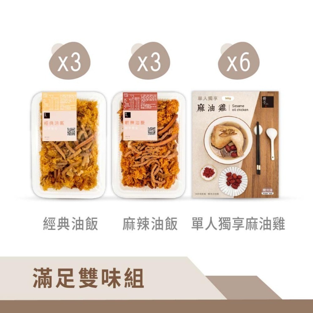 內容物/規格/重量/尺寸/數量:6入油飯(經典油飯*3/麻辣油飯*3)(375gX6)+單人麻油雞(500gX6)