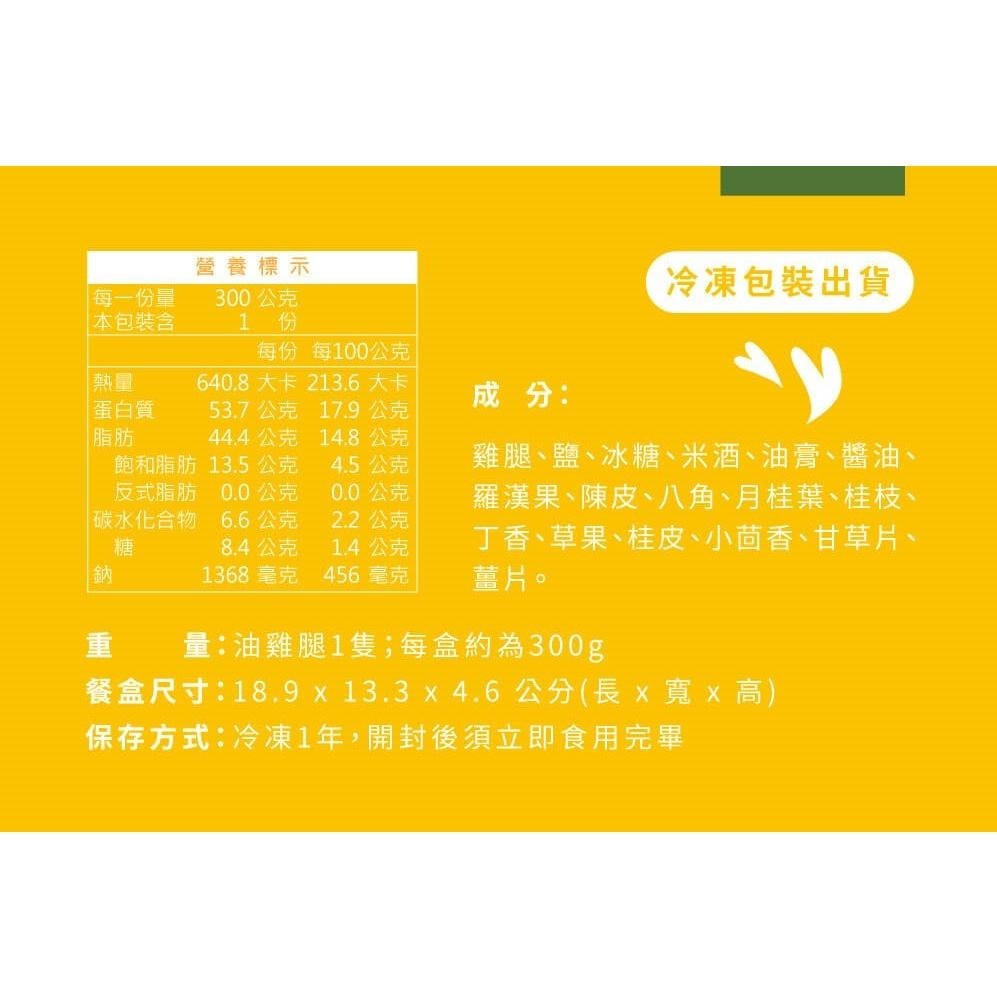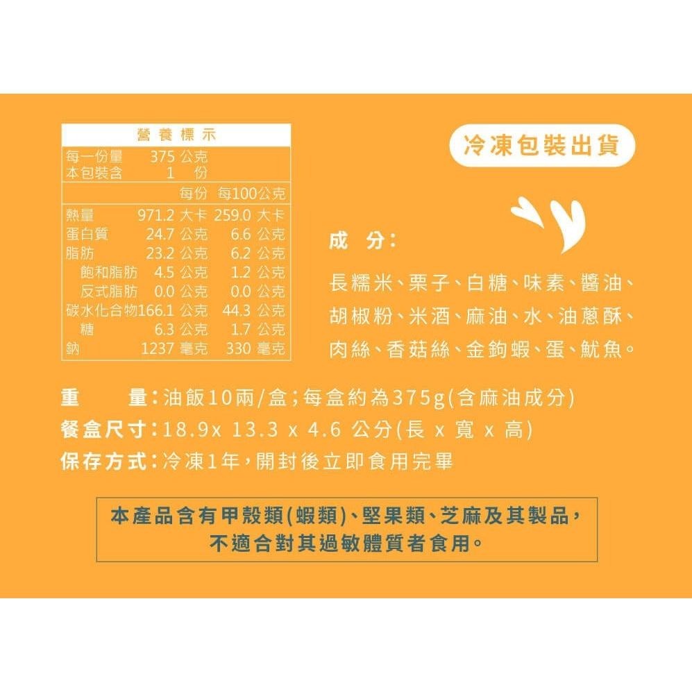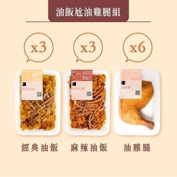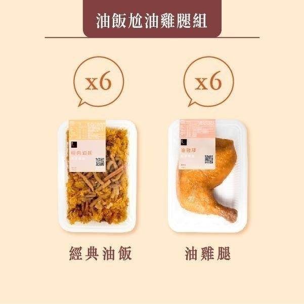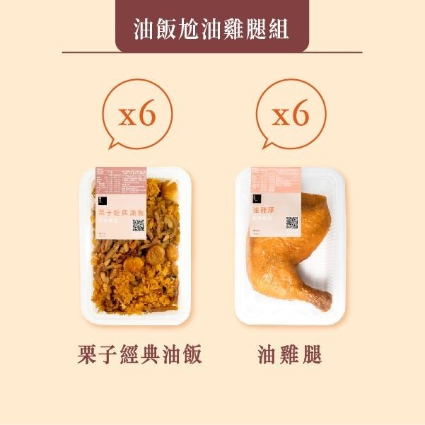 內容物/規格/重量/尺寸/數量:油飯6入(375gX6)、雞腿(250gX6)