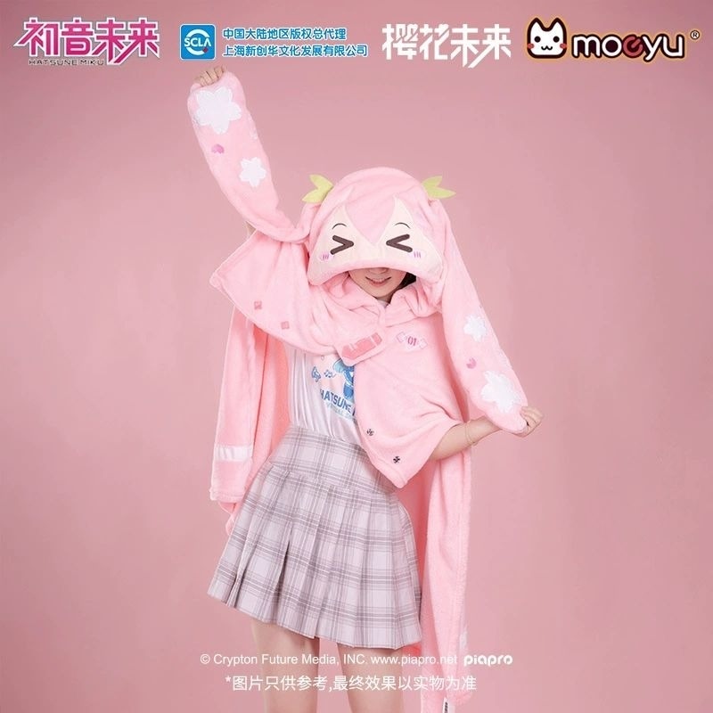 Moeyu 櫻花未來 瞇瞇眼系列 多功能 連帽 空調毯 抱枕保暖法萊絨披肩