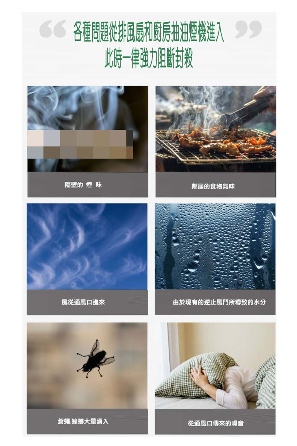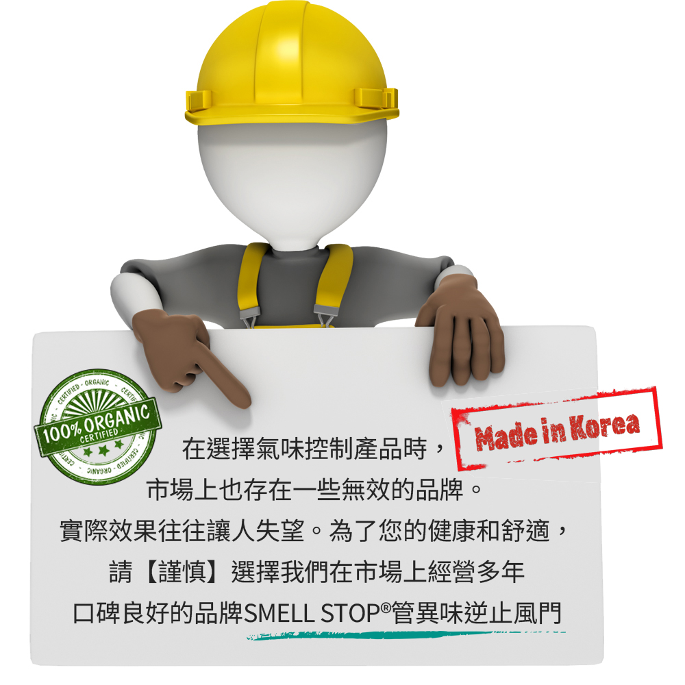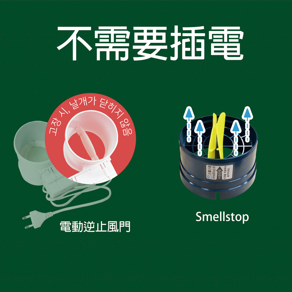 採用韓國管異味逆止風門可以解決改善一般換氣扇的簡易逆止閥門漏氣問題,並阻隔管道間的二手煙味、異味及戶外灰塵油煙等異味到灌回流。