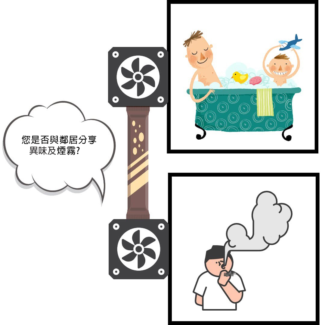 在台灣有許多住宅是採取共用管道間,所以會有許多異味、煙味會藉由共用管道間倒灌入侵,此時有可能是管道間密封不全或換氣設備的逆止閥氣密度不夠等問題,另外在新大樓當層排氣的狀態下,有時會遇到強風倒灌回流。而把戶外的灰塵油煙等異味帶入。