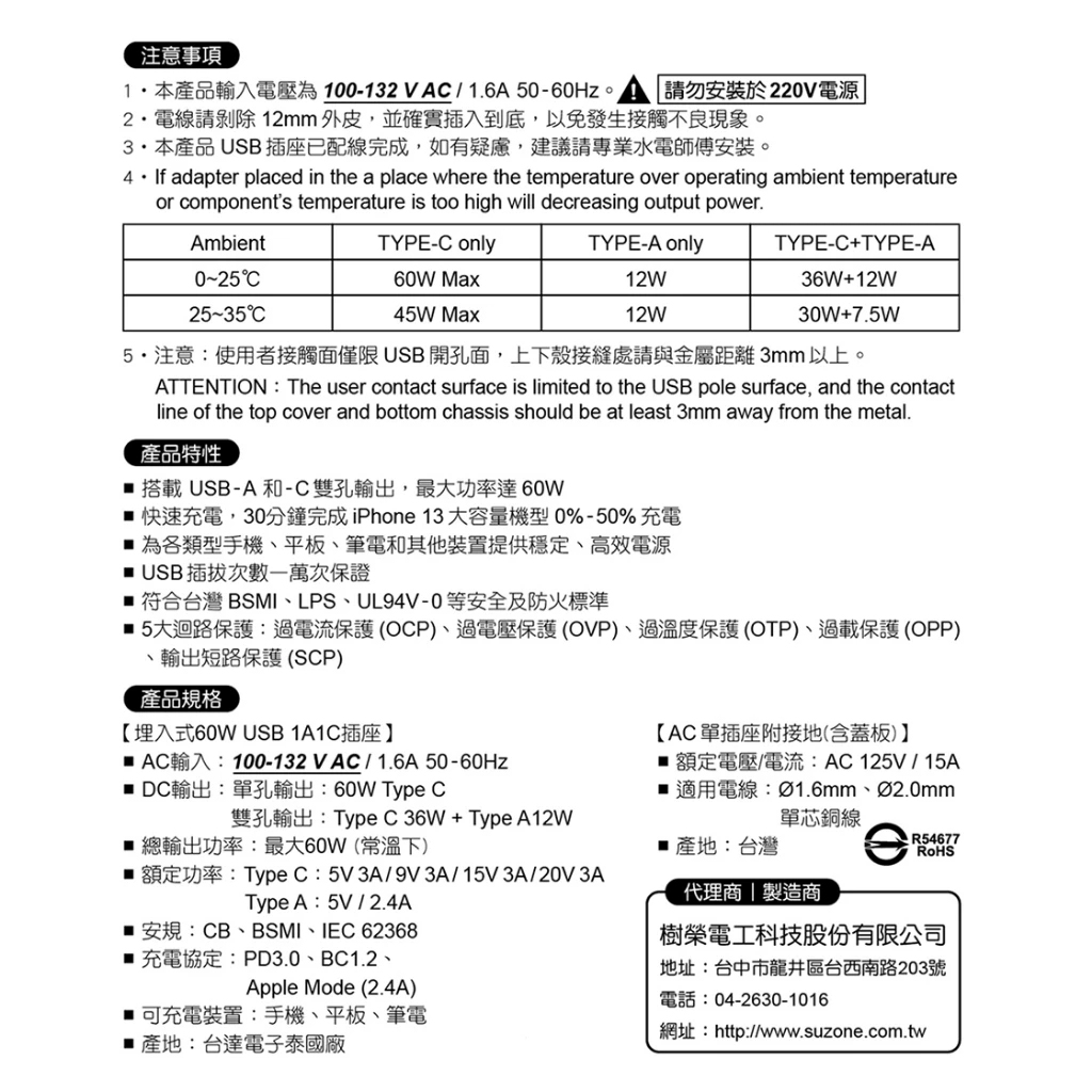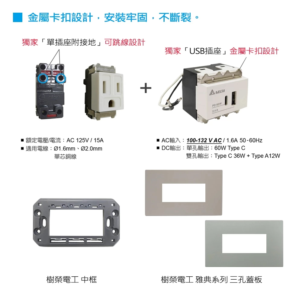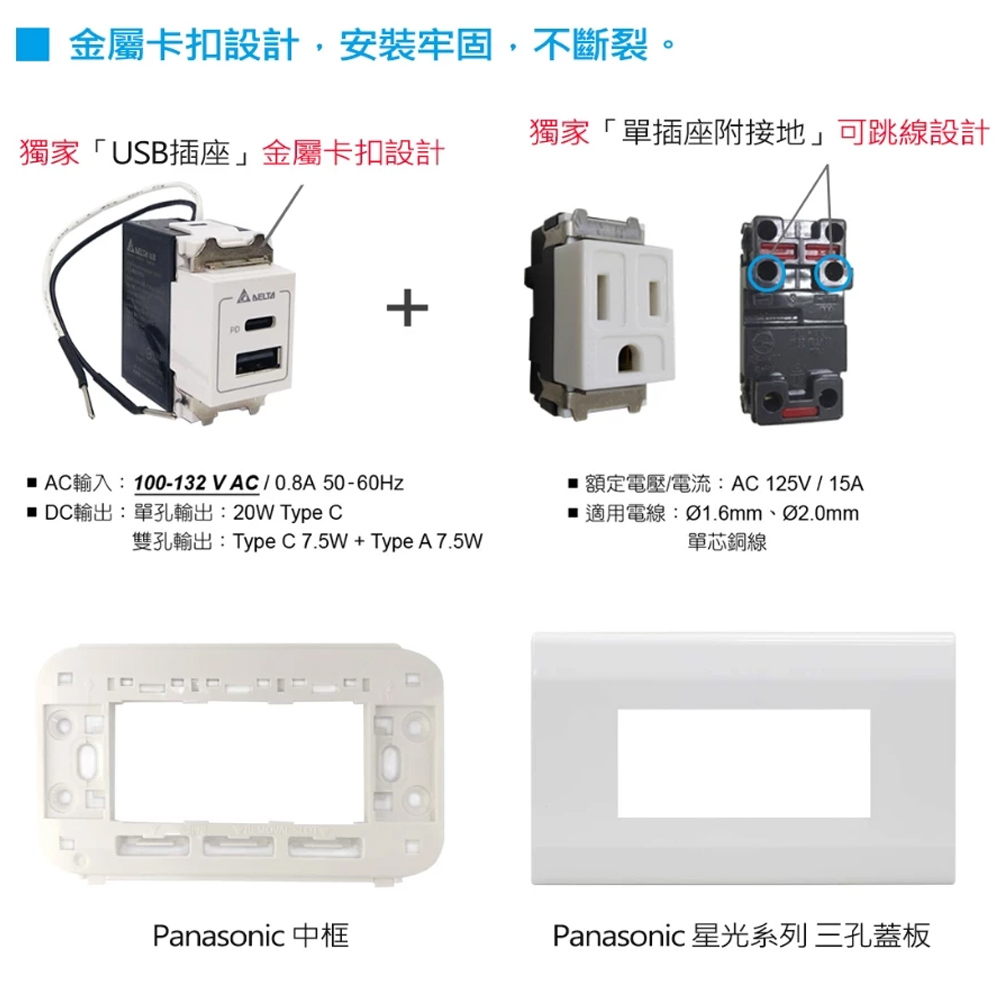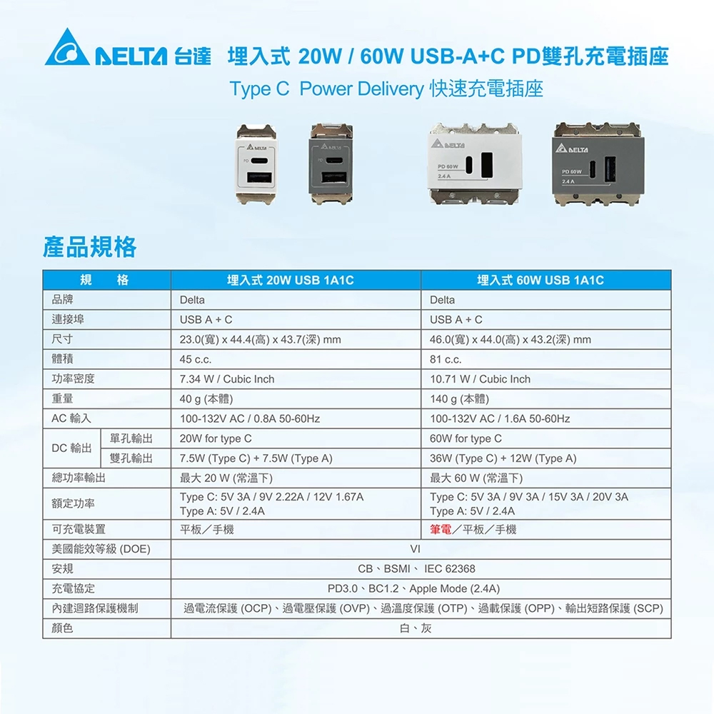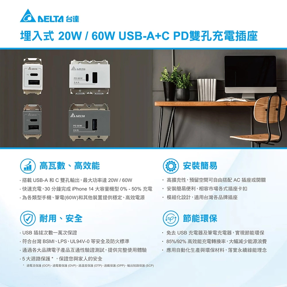 【DELTA台達】樹榮新普雅典/國際牌星光 60W充電插座 A+C PD雙孔充電插座 USB快充插座 Type C插座