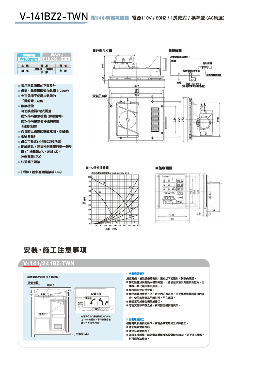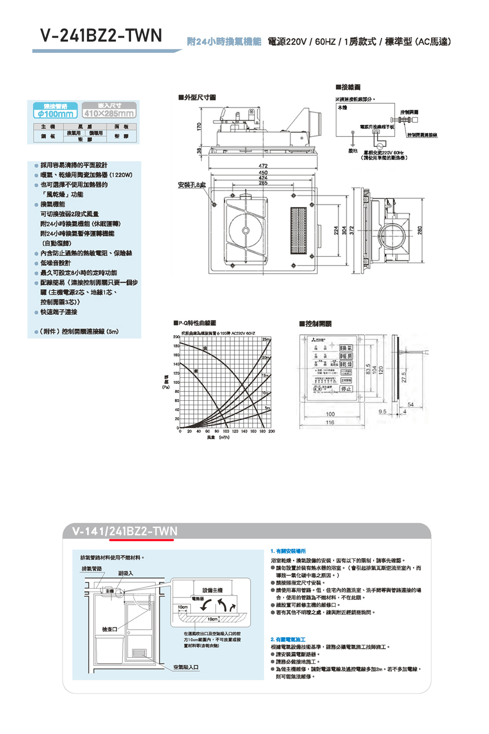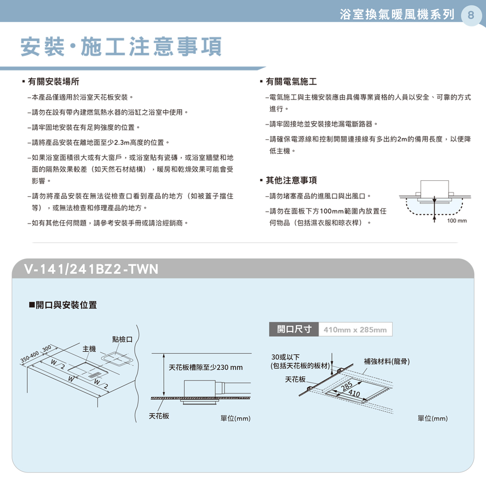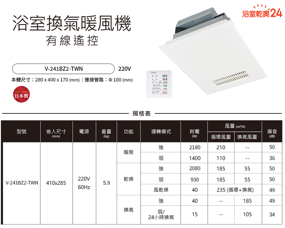 【MITSUBISHI 三菱 】浴室暖風乾燥機 暖風機 (線控) V-141BZ2-TWN / V-241BZ2-TWN