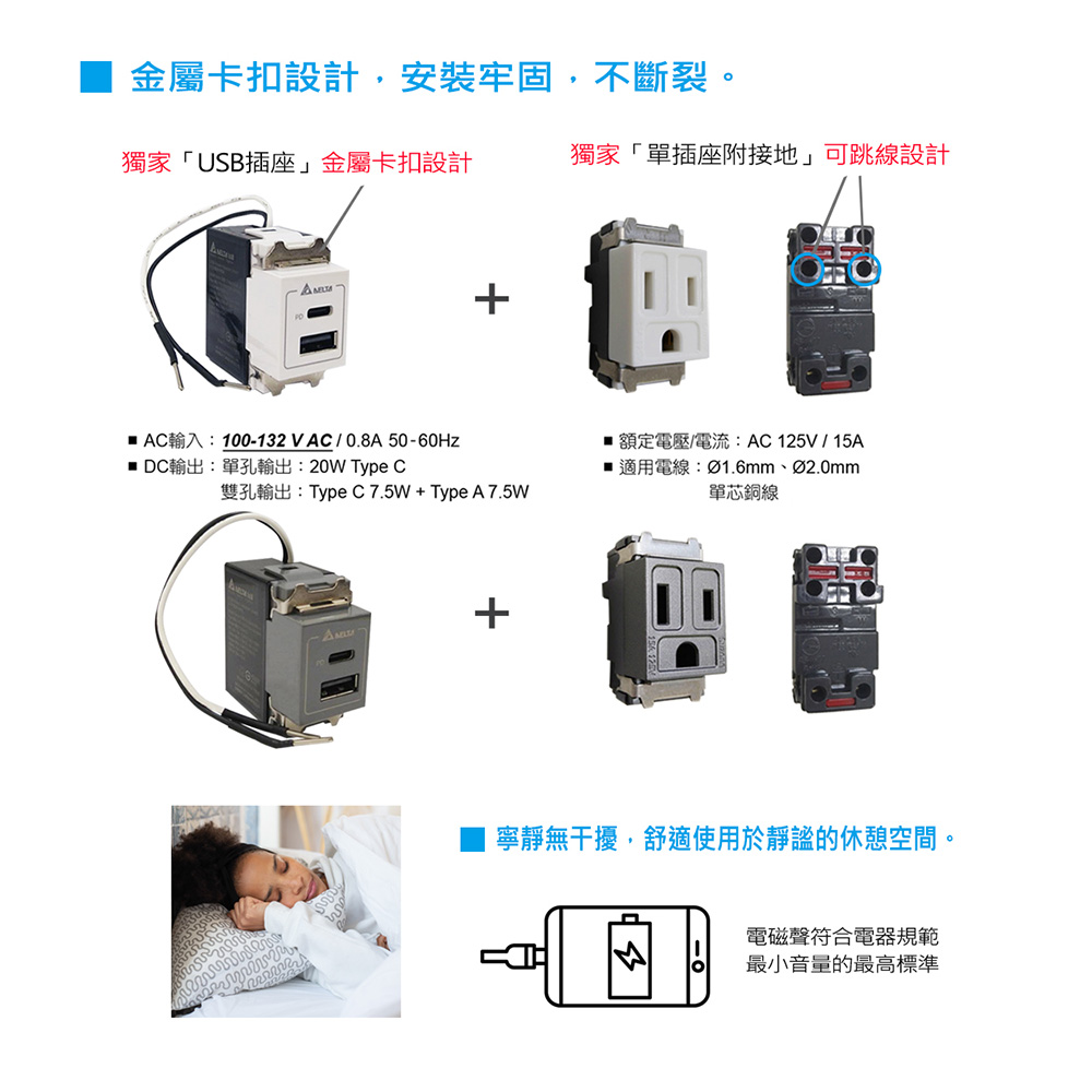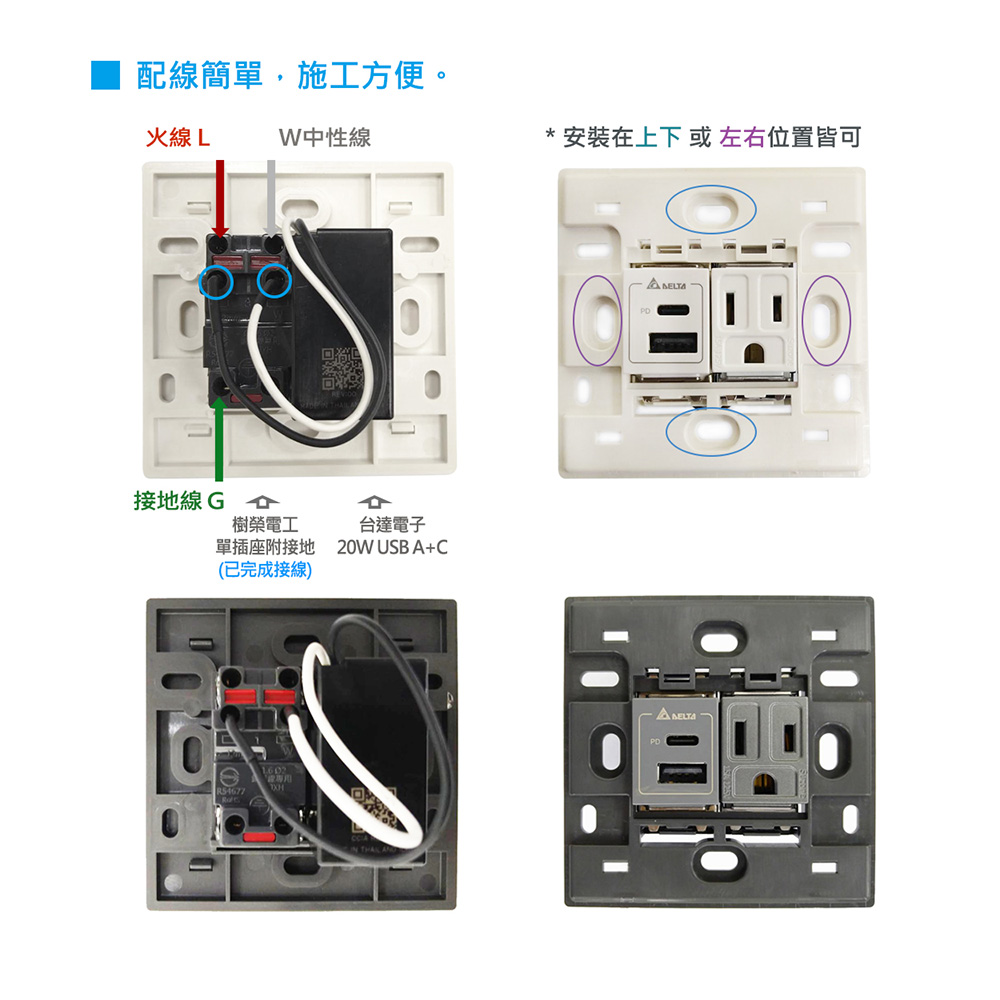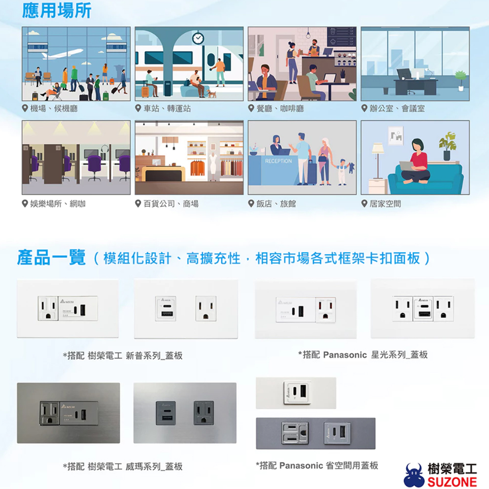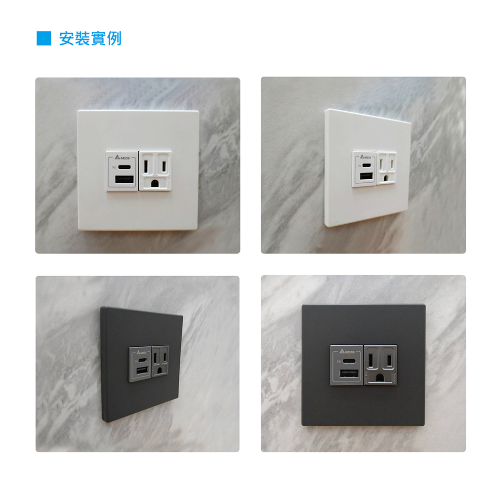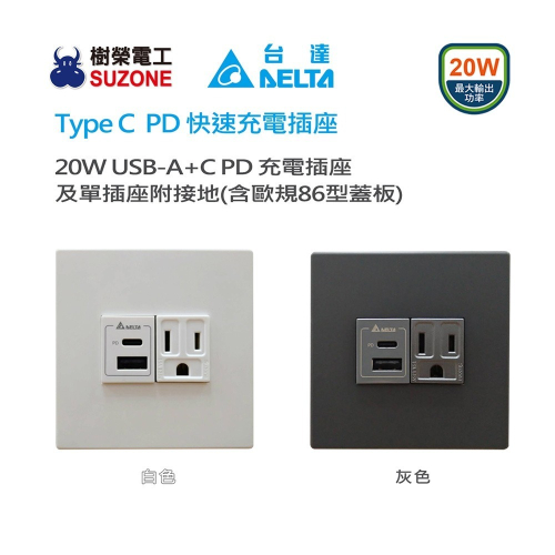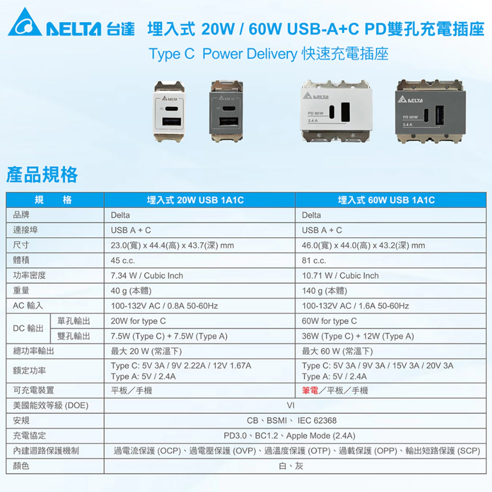 【DELTA台達】樹榮 歐規面板 20W充電插座 A+C PD雙孔充電插座(白/灰) USB快充插座 Type C插座
