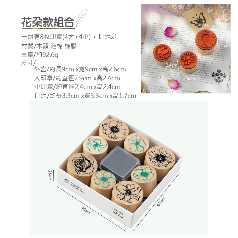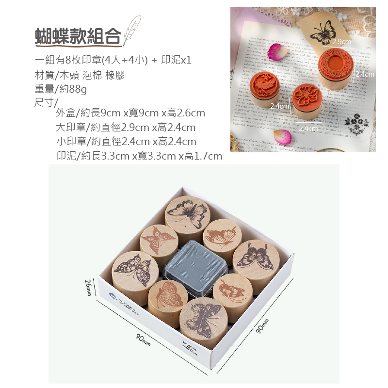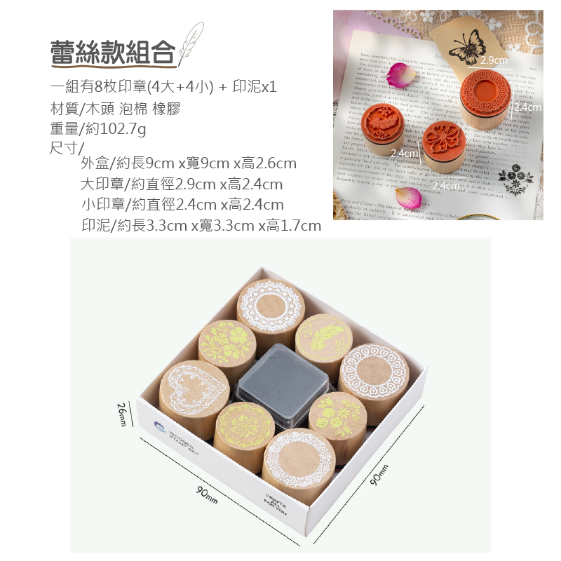 說明:有花朵/蝴蝶/蕾絲3款印章組合可選,每款有8枚印章 + 印泥x1