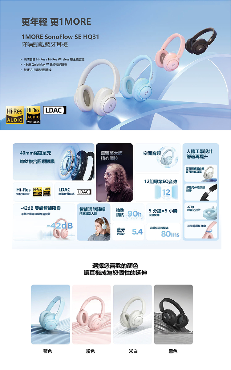 #1MORE #萬魔聲學 #sonoflow #HQ31 #Hi-RES #LDAC #真無線 #藍牙耳機 #頭戴式 #耳罩 #降噪 #SE #快充 #周杰倫 #代言