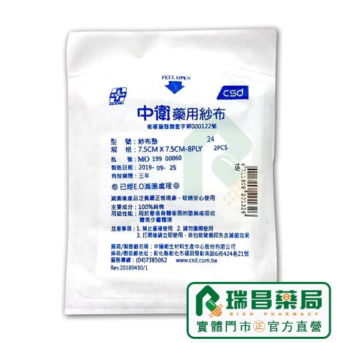 商品名稱 中衛藥用紗布 (滅菌) 商品規格 7.5x7.5cm 2片裝 主要成分 100%純棉 產品說明 用於患者身體表面的塗藥或吸收體表少量體液。 滅菌後產品泛黃屬正常現象,敬請安心使用。 使用方式 【依包裝上標示為主】。 注意事項 禁止重複使用。 請勿攤開使用。 打開後請立即使用,若包裝破損即失去滅菌效果。 醫療器材許可證所載核准字號 衛署醫器製壹字第000122號    醫療器材許可證所載品名 中衛藥用紗布 (滅菌/未滅菌)    醫療器材許可證所載藥商名稱 申請商: 0403111200 中國衛生材料生產中心股份有限公司 彰化縣彰化市福田里彰南路六段424巷21號 製造廠名稱及地址 主製造廠: 0403111600 中國衛生材料生產中心股份有限公司 彰化市福田里彰南路六段424巷21號 藥商許可執照所載藥商名稱 瑞昌藥局 藥商地址 台中市北區學士路155號 藥商許可執照字號 中市藥局字第5903260789號 產品製造日期 因商品批號不同所以製造日期也會不同,請依實際收到商品為主。 有效期間或保存期限 三年 藥商諮詢專線電話 若有疑問歡迎您撥打04-22060427瑞昌藥局! (諮詢時間:週一~週五 上午9:00~下午18:00) 專業藥師團隊將竭誠為您服務! 保存方式 請置於陰涼乾燥處,避免陽光直接照射。 產 地 台灣 備  註 商品圖文顏色可能因顯示螢幕設定差異會略有不同,以實際商品為主。 如下單時遇原廠商品改版包裝,會主動跟您聯繫告知,以實際商品為主,圖片僅供參考。 其 他 若有疑慮歡迎詢問,感謝您~ 專業藥師團隊將竭誠為您服務!