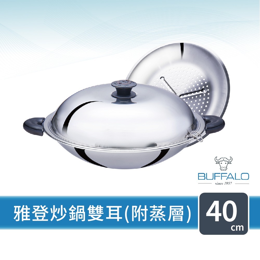 【Buffalo牛頭牌】新雅登304不鏽鋼雙耳炒鍋40cm(附專用蒸層)
