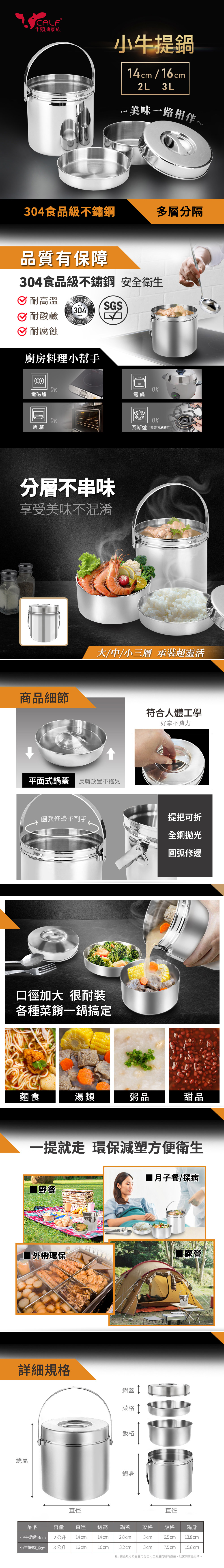 【Buffalo牛頭牌】小牛不鏽鋼提鍋14cm/2L(附二隔層)304不綉鋼 飯盒 便當盒
