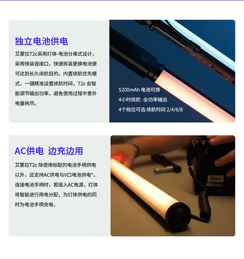 採用燈體-電池分離設計,T2c全功率輸出可使用4小時,T4c全功率輸出可使用1.7小時。且手柄採用快裝設計,一秒快速拆裝。在長時間拍攝時,只需更換電池手柄便可長久續航,還可避免一體式設計的電池衰退等問題,最大程度上縮減換新成本。