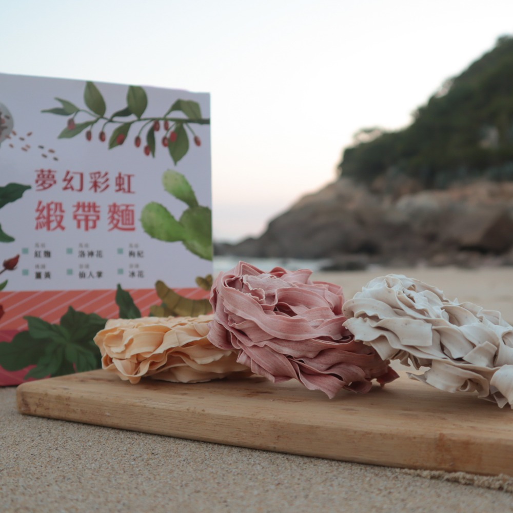 緞帶麵分別使用六種來自島嶼小農們生產的紅鞠(馬祖).冰花(澎湖).仙人掌(澎湖).薑黃(桃園).枸杞(馬祖).洛神花(澎湖)的天然顏色,結合台南歸仁日曬麵的製麵技術以台南關廟麵的麵體為基礎開發出六種顏色的緞帶麵。