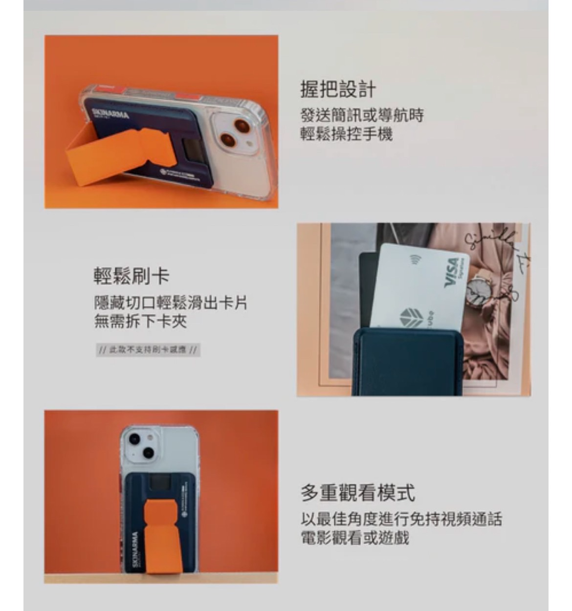 附特選薄膜背膠,支持非 MagSafe 設備使用智能使用模式,可輕鬆使用手機輕鬆刷卡,隱藏切口輕鬆滑出卡片以最佳角度多重觀看模式握把設計,輕鬆操控手機的四角