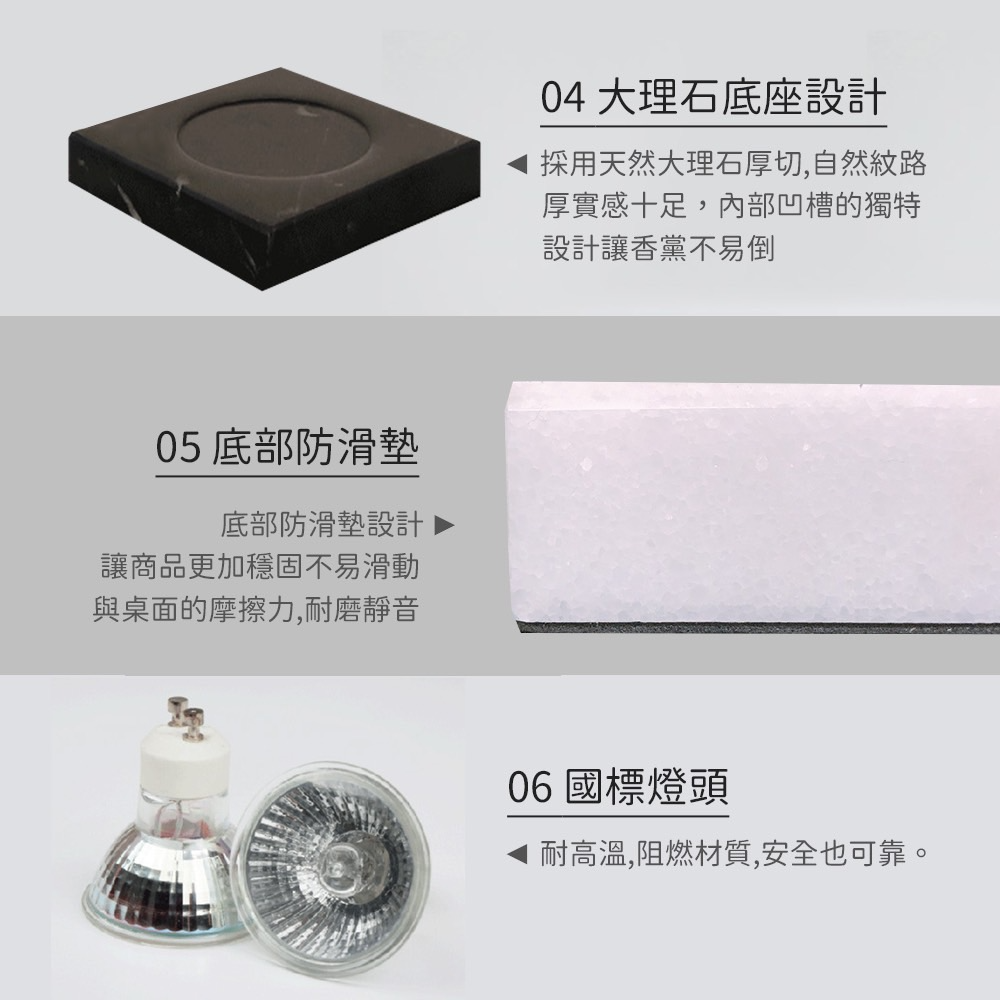 ● 燈具造型簡約,大理石材質底座擺放平穩,融燭燈質感瞬間提升