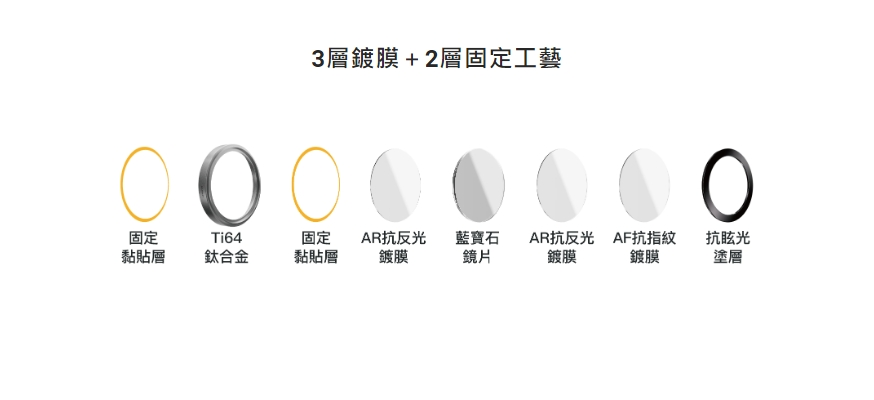 雙層抗反光鍍膜與抗眩光塗層,達到極致透光,確保成像清晰 - 外層AF抗指紋鍍膜