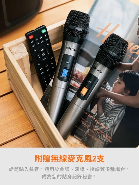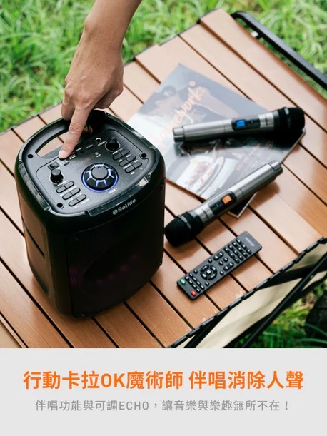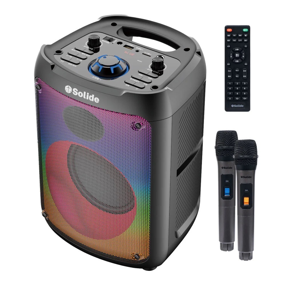 藍牙5.0連接,搭配手機螢幕隨時享受無線卡拉OK歡唱超大型高靈敏度揚聲器、低頻震撼,中/高頻完美呈現可調整ECHO,伴唱功能讓卡拉OK功能完美呈現全彩變換LED情境燈,讓你整夜Party non-stopTWS功能擴充更方便,麥克風變聲效果器增添趣味支援32GB,USB裝置記憶卡音頻撥放內建充電保護,電池使用壽命更長更穩定內建大容量電池,可使用長達5小時專用遥控器,隨時方便調整使用低電提醒、低功耗充放電附贈兩隻VHF無線麥克風