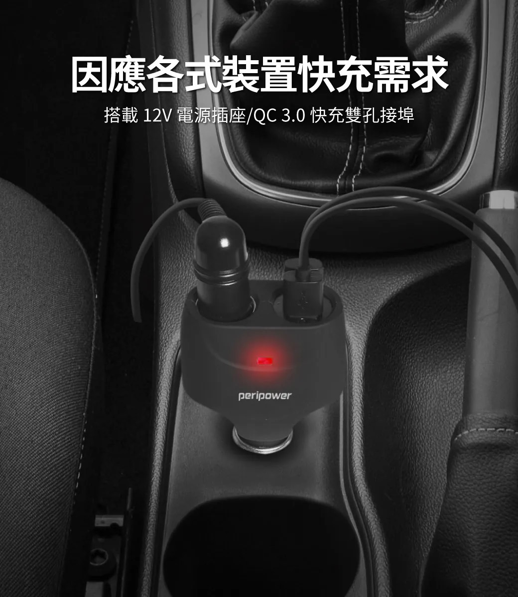 • 搭載 12V 電源插座 + QC 3.0 快充雙孔接埠,因應車用電器使用以及各式裝置快充需求