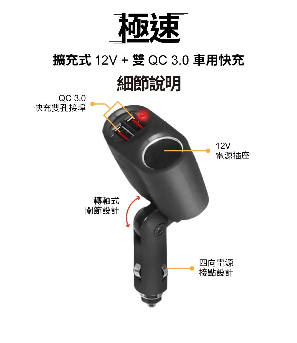 .搭載 12V 電源插座 + QC 3.0 快充雙孔接埠,因應車用電器使用以及各式裝置快充需求