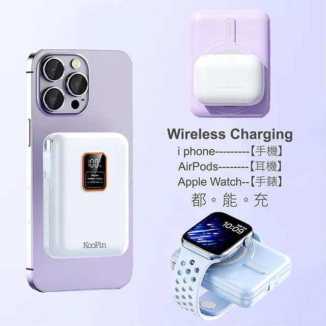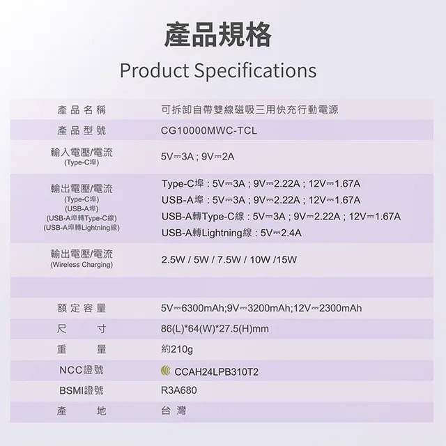 - 自帶 Type-C、Lightning 可拆式充電線 液晶數字電量顯示,超輕重量 210g