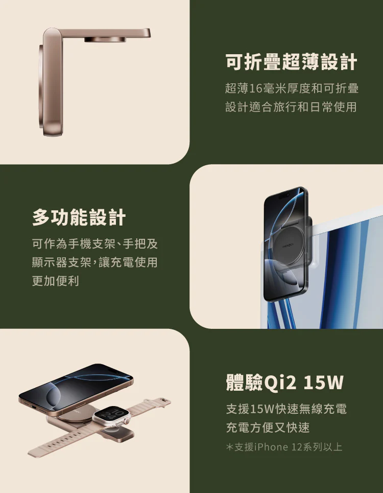 • 多功能設計:可作為手機支架、手把及顯示器支架,讓充電使用更加便利。