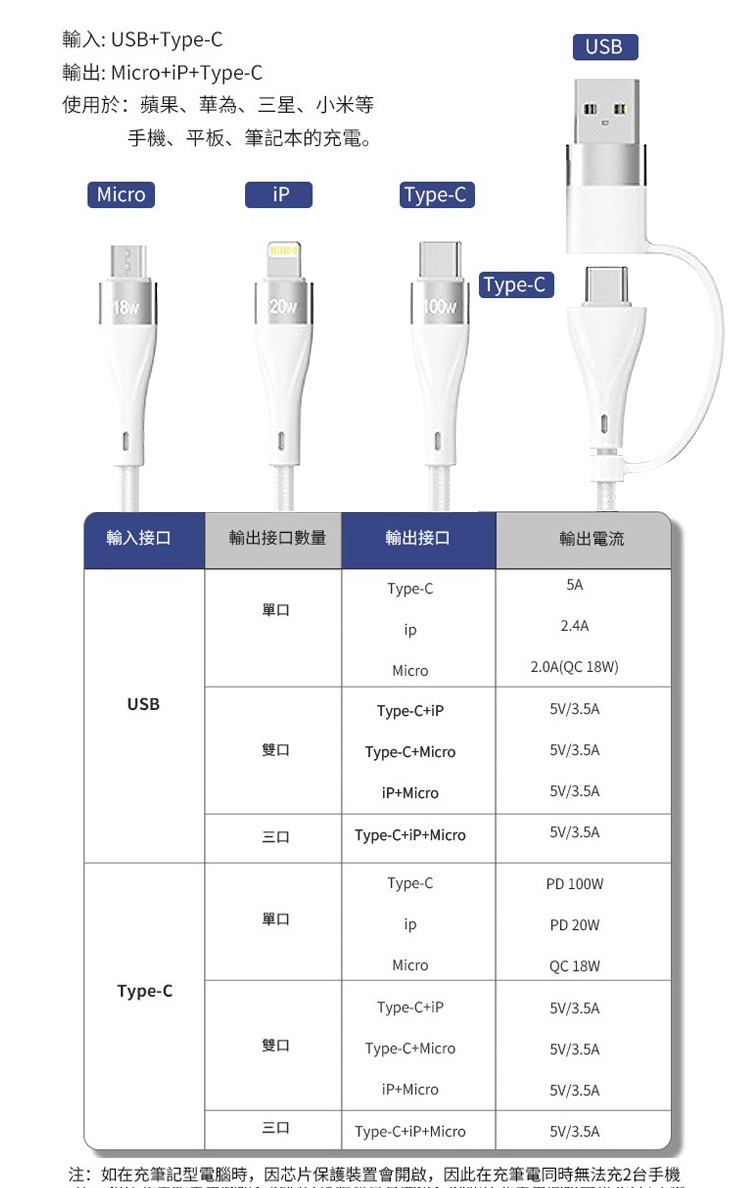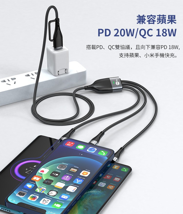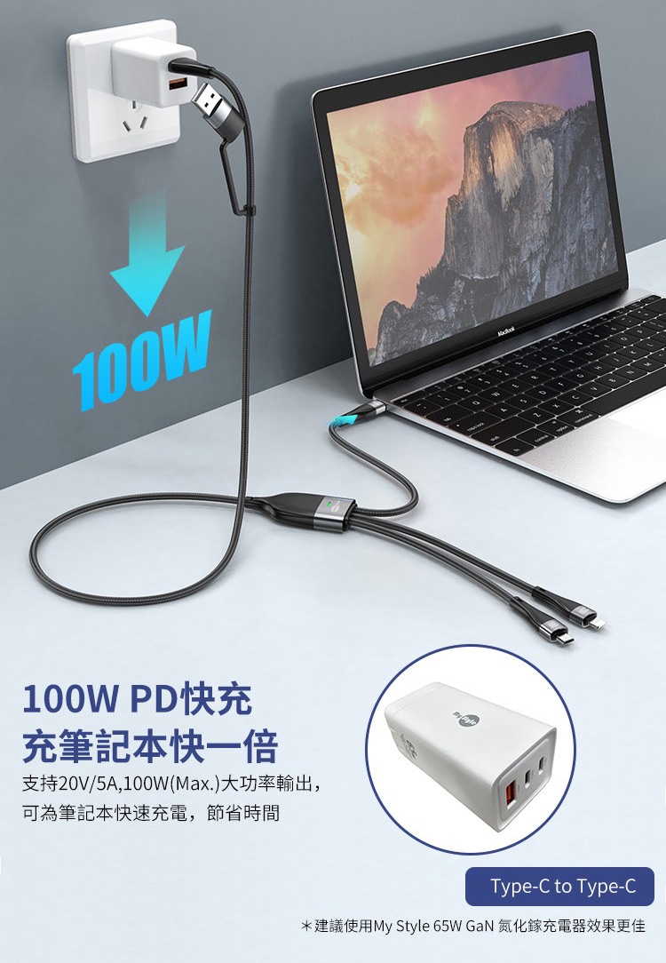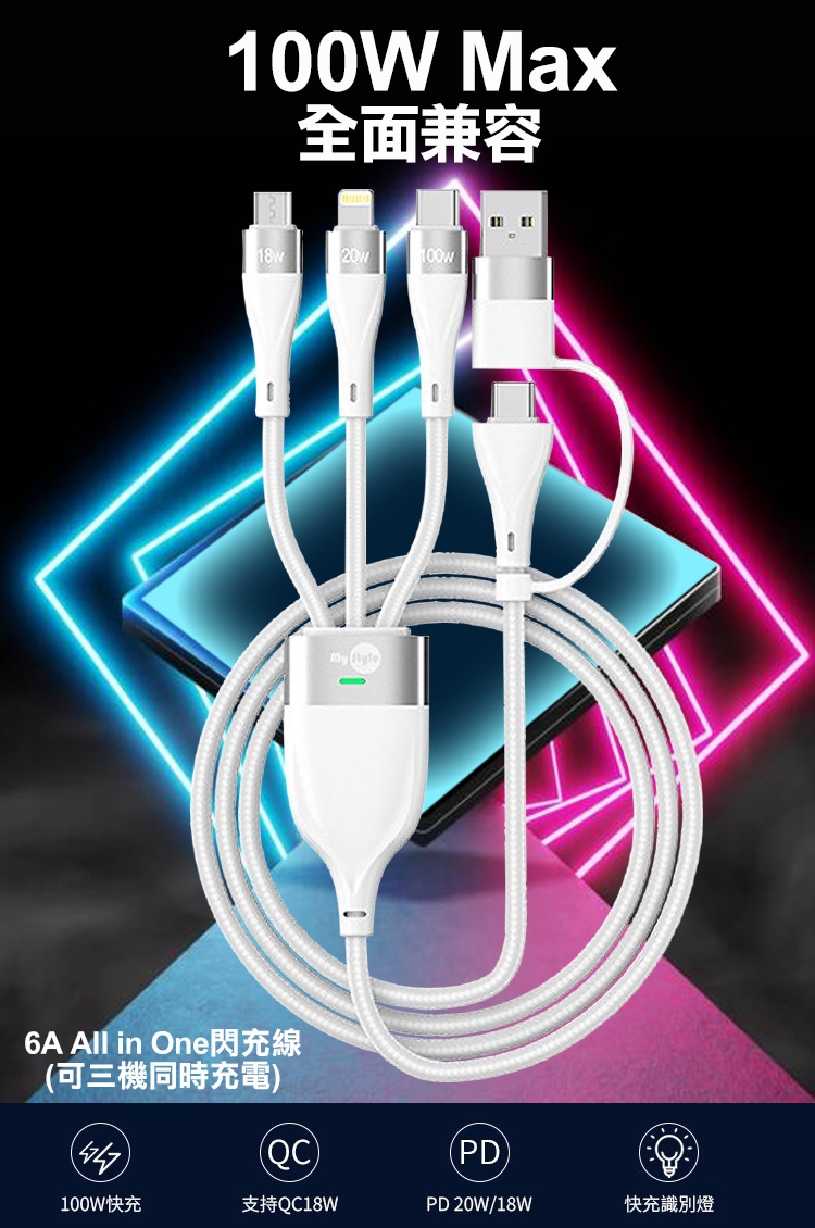 MyStyle 6A 二出三急速萬用充電線(usb+Type-C TO iphone+Micro+Type-C)