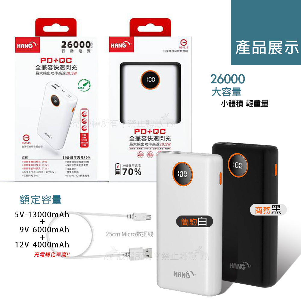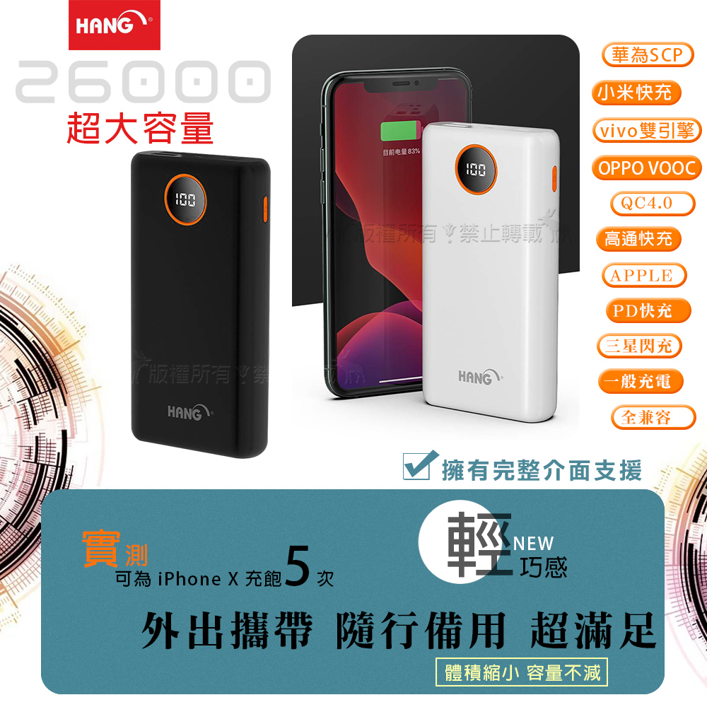 HANG 26000輕巧大容量 PD+QC4.0 3A雙向快充