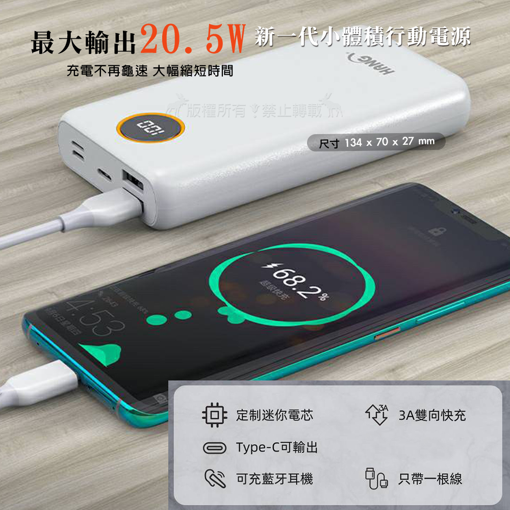 HANG 26000輕巧大容量 PD+QC4.0 3A雙向快充行動電源 最大輸出20.5W