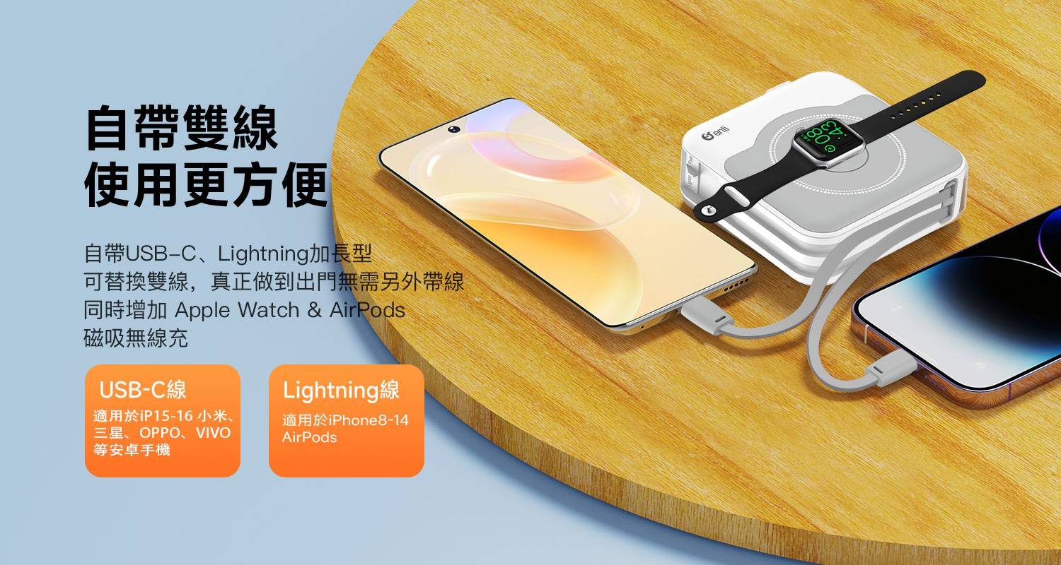 加長的自帶線設計,方便隨時充電,更巧妙地結合手機支架功能,解放雙手,追劇、視訊更輕鬆。