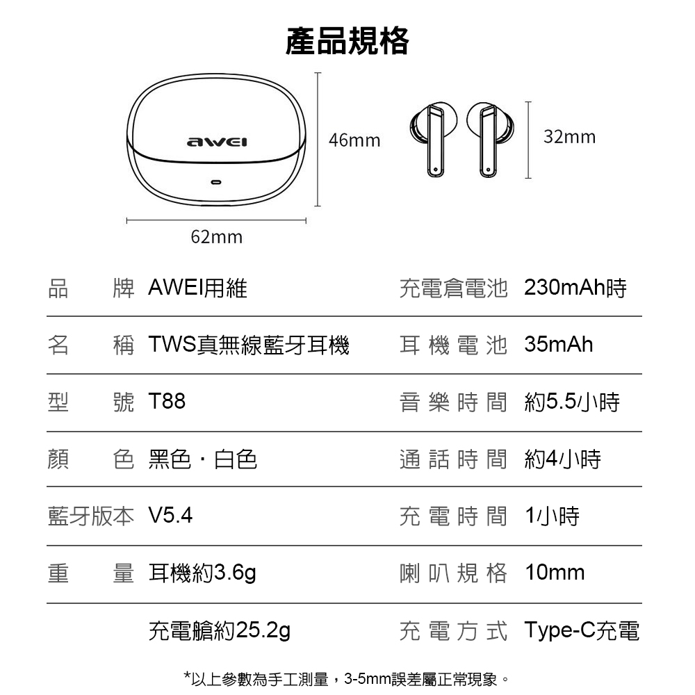 AWEI T88 真無線藍牙耳機(無線藍牙耳機)