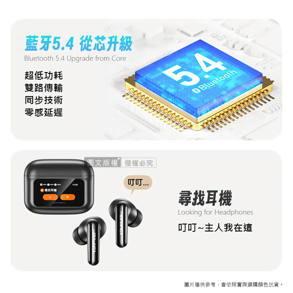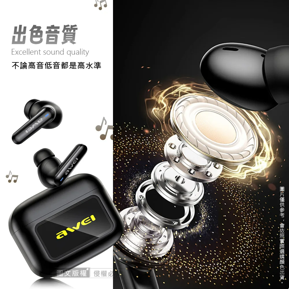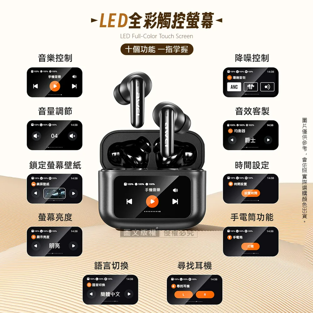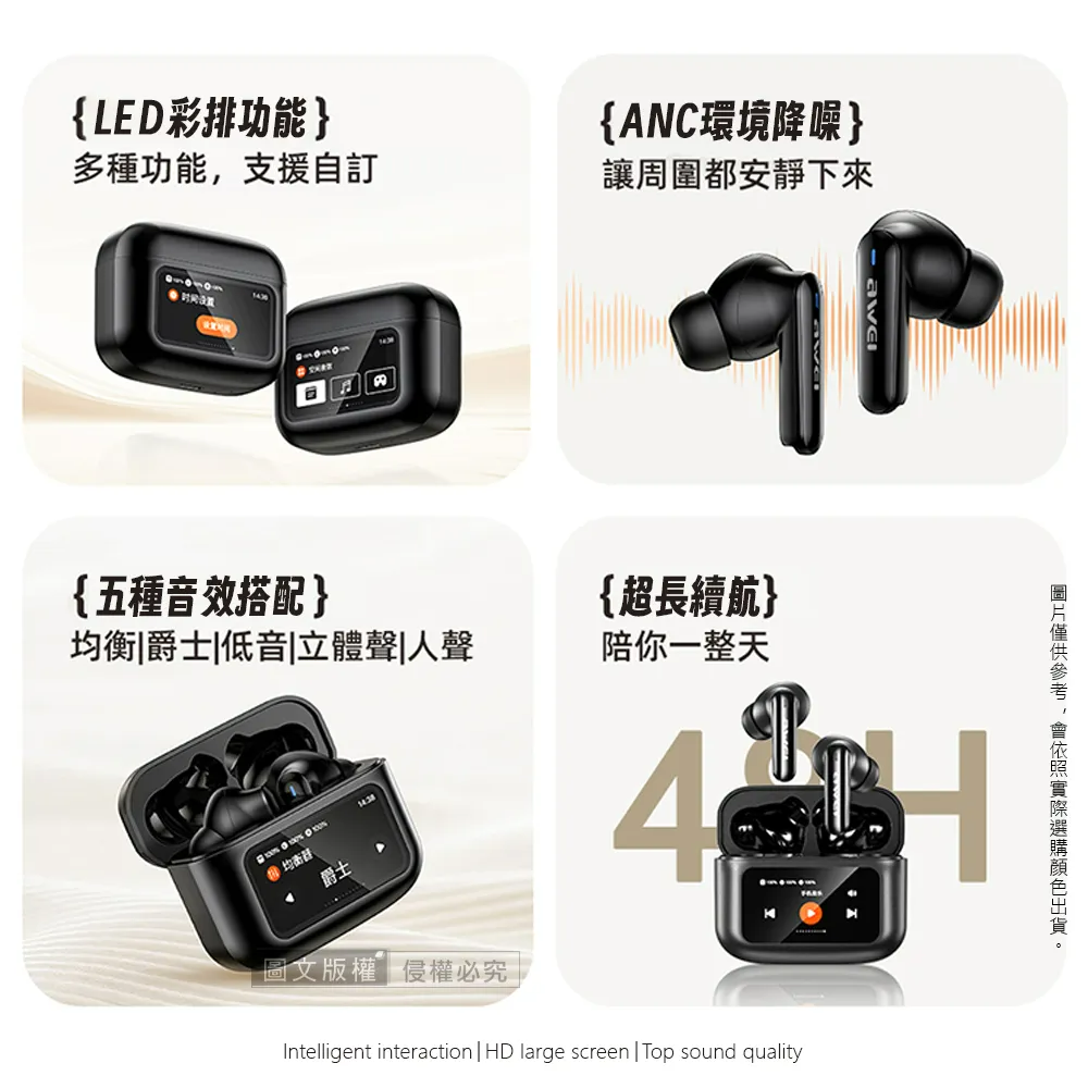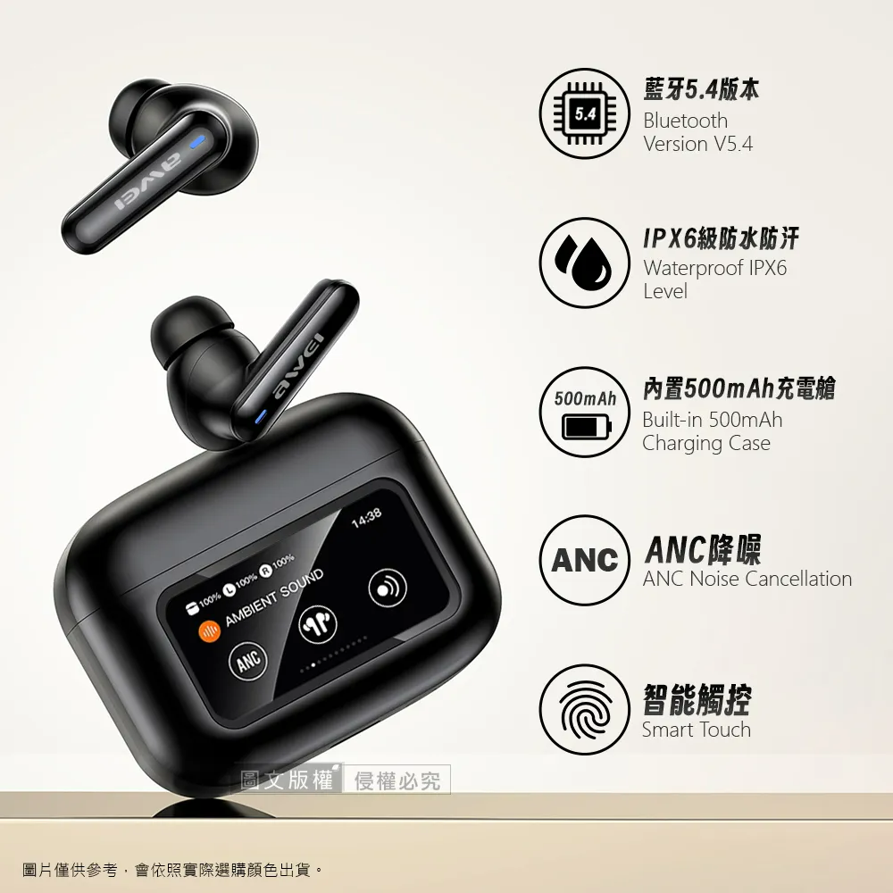 AWEI 用維ANC主動降噪 彩色觸控螢幕藍牙耳機 藍牙5.4/IPX6防水