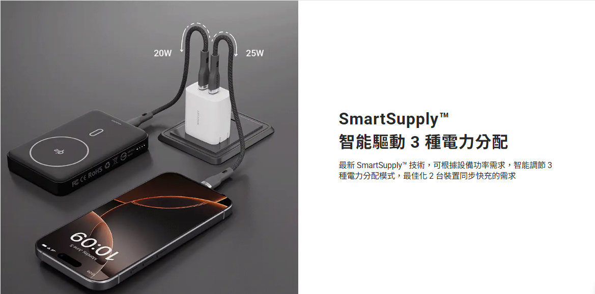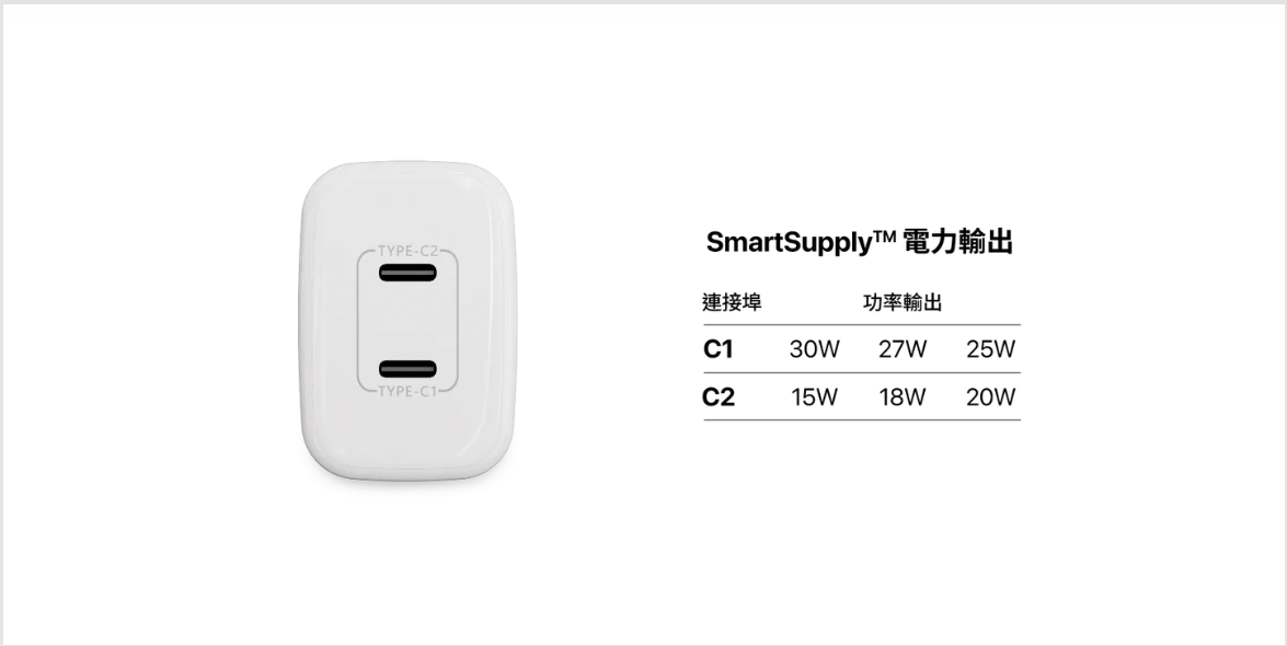 • 最新 SmartSupply™  技術,可根據設備功率需求,智能調節 3 種電力分配模式,最佳化 2 台裝置同步快充的需求