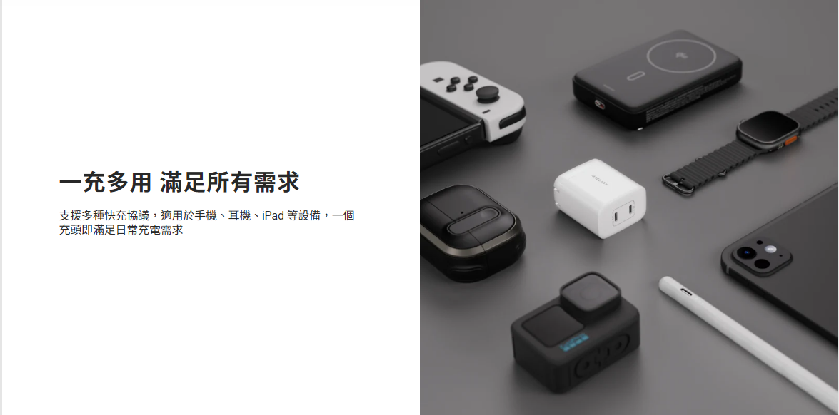 • 支援多種快充協議,適用於手機、耳機、iPad 等設備,一個充頭即滿足日常充電需求