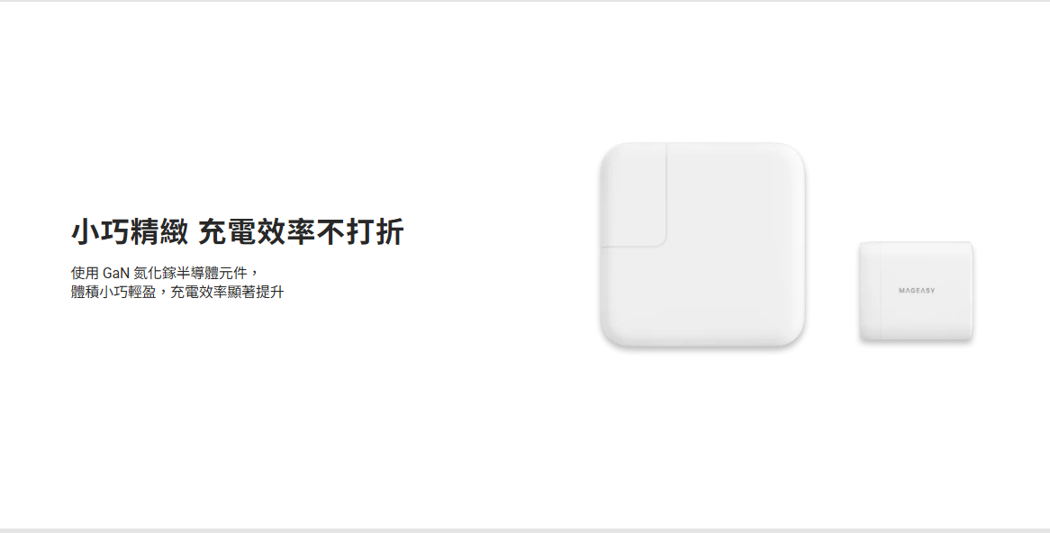 • 使用 GaN 氮化鎵半導體元件,體積小巧輕盈,充電效率顯著提升