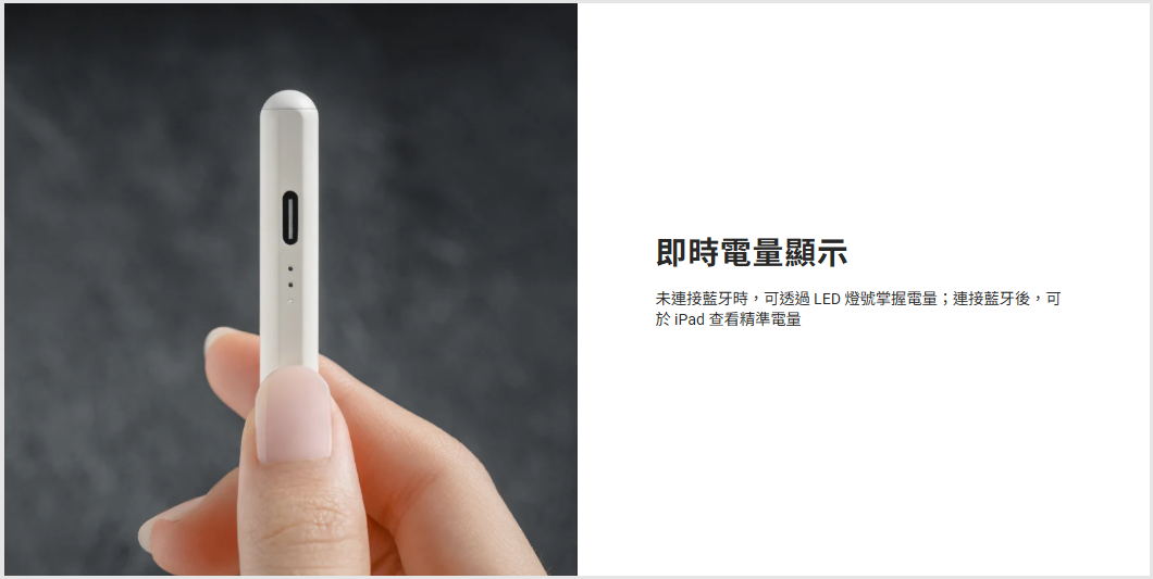 • 即時電量顯示:未連接藍牙時,可透過 LED 燈號掌握電量;連接藍牙後,可於 iPad 查看精準電量