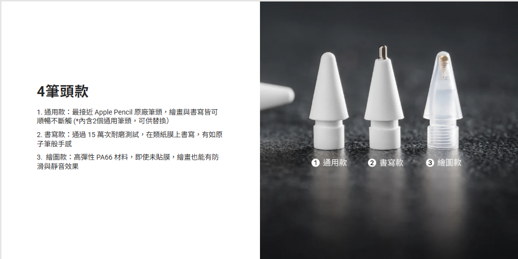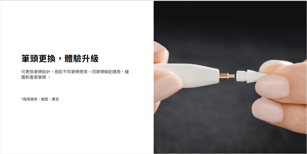• 筆頭更換,體驗升級:可更換筆頭設計,搭配不同筆頭使用。四筆頭版配通用、繪圖和書寫筆頭
