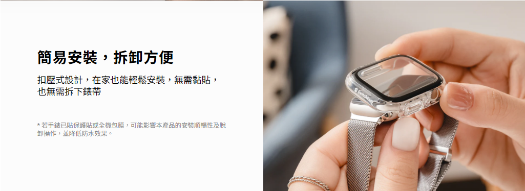 扣壓式設計,在家也能輕鬆安裝,無需黏貼,也無需拆下錶帶