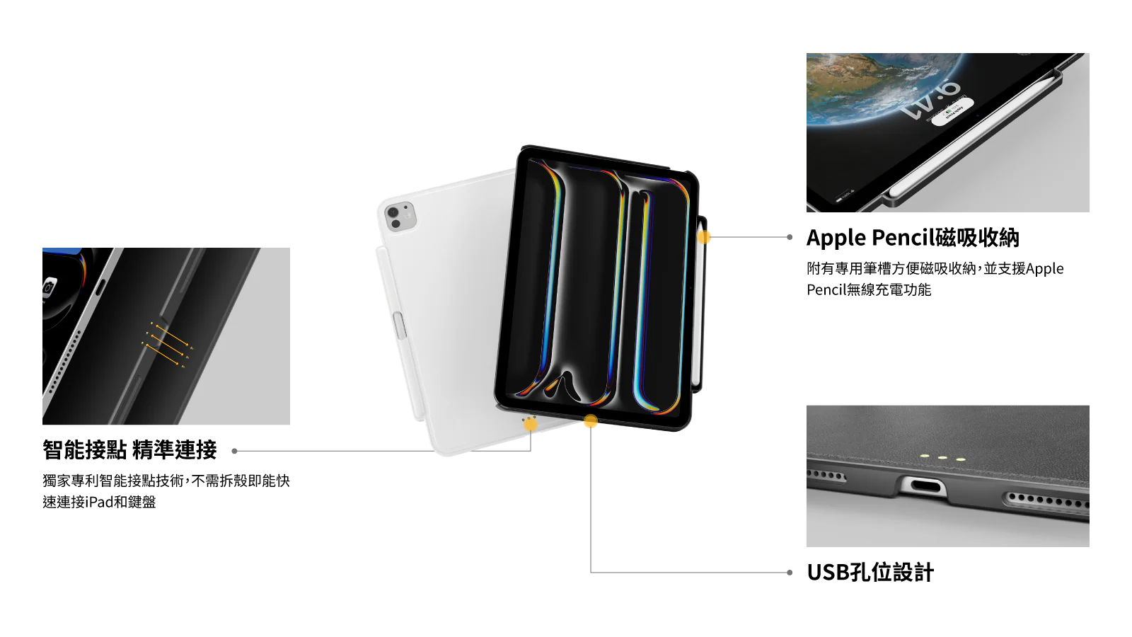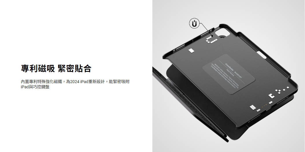 • 內置專利特殊強化磁鐵,為2024 iPad重新設計,緊密吸附iPad與巧控鍵盤