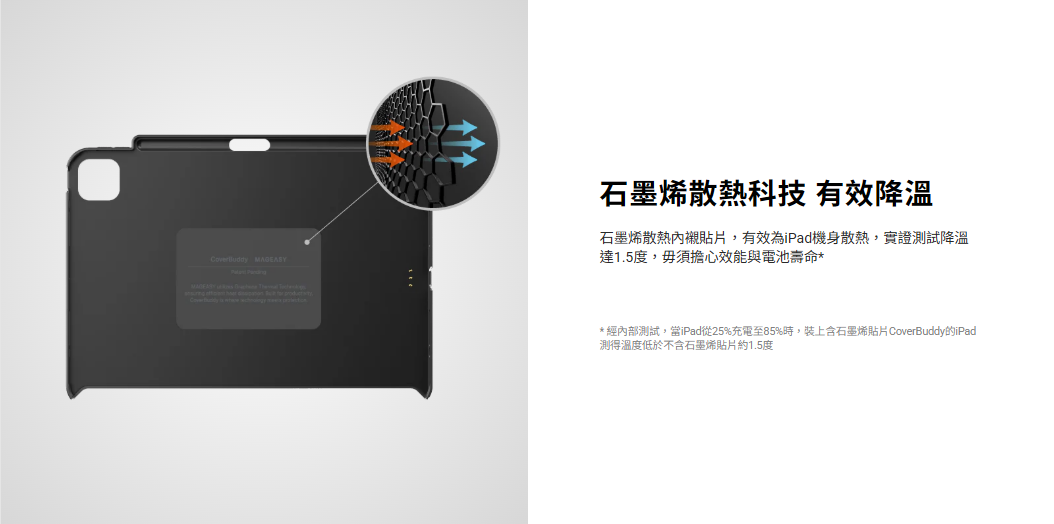 * 經內部測試,當iPad從25%充電至85%時,裝上含石墨烯貼片CoverBuddy的iPad測得溫度低於不含石墨烯貼片約1.5度
