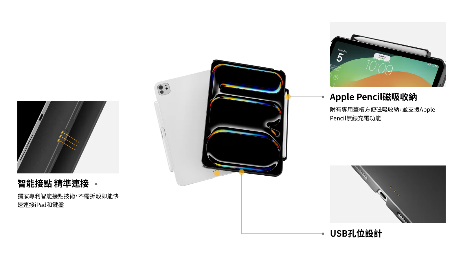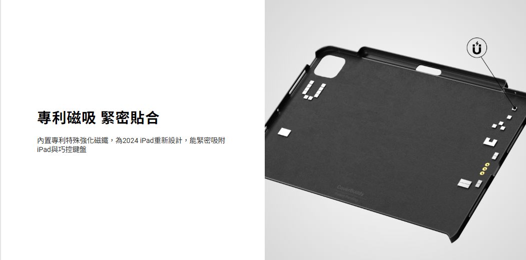內置專利特殊強化磁鐵,為2024 iPad重新設計,緊密吸附iPad與巧控鍵盤