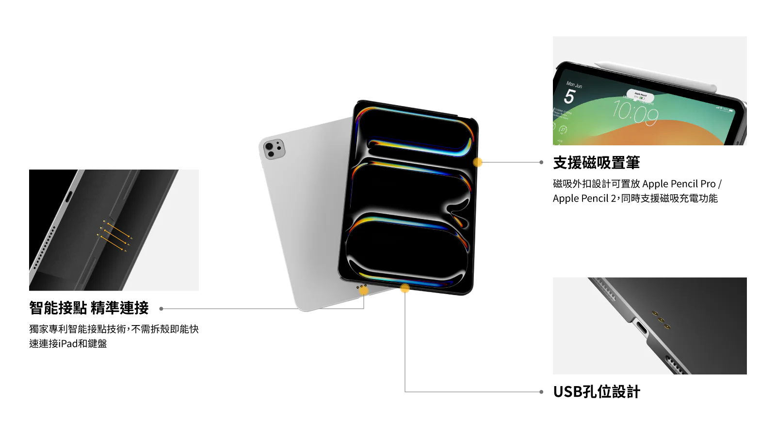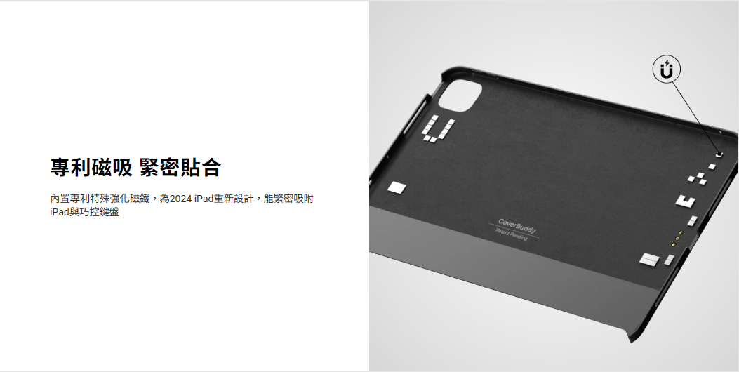 內置專利特殊強化磁鐵,為2024 iPad重新設計,緊密吸附iPad與巧控鍵盤