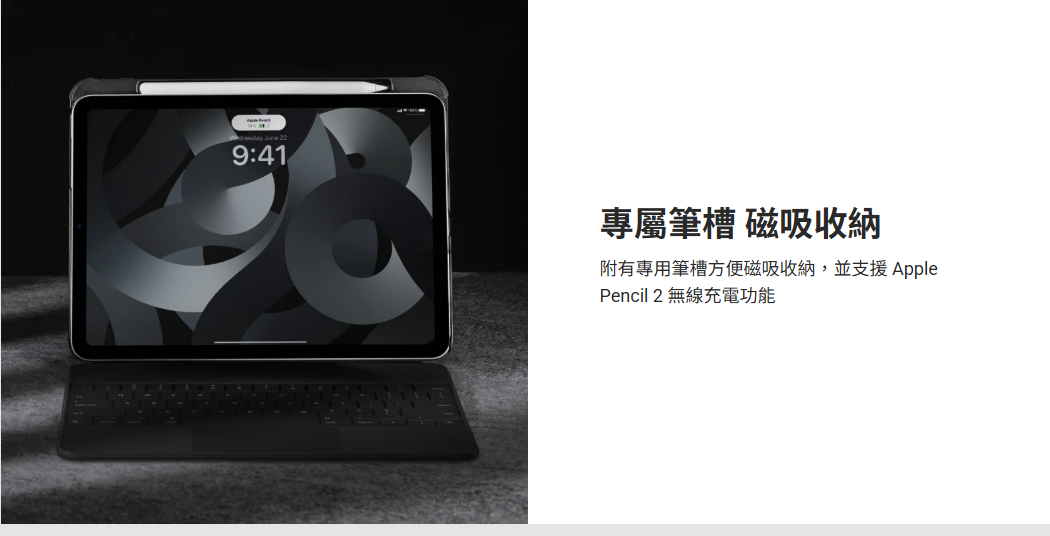 • 附有 ApplePencil 專用筆槽,貼心收納並支援 ApplePencil 2 磁吸充電