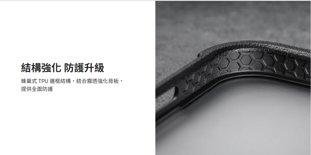 • 霧透強化背板、蜂巢式軟邊框結構,提供雙層保護