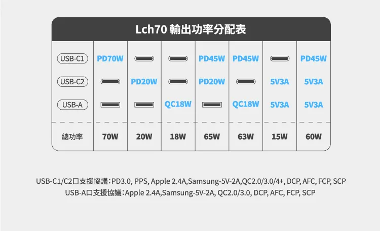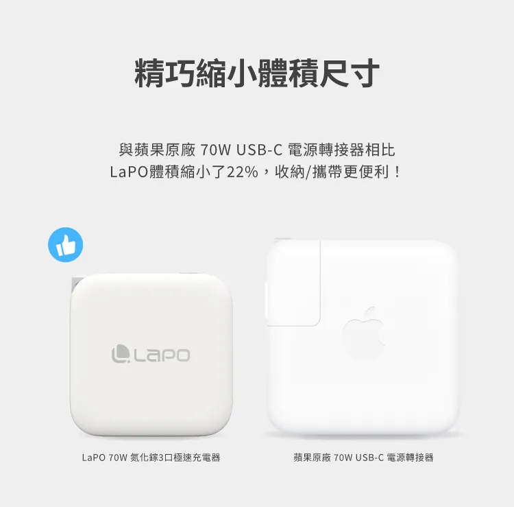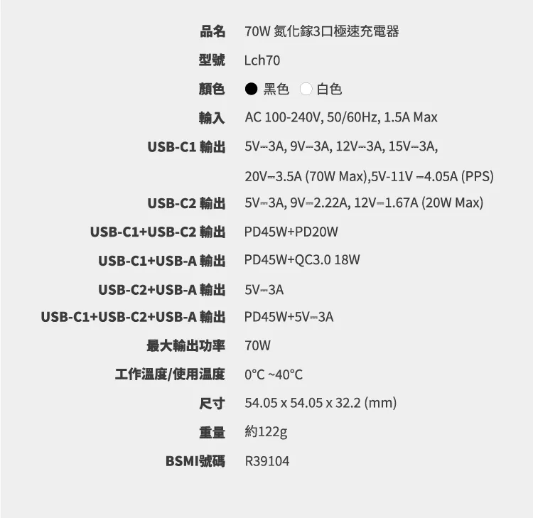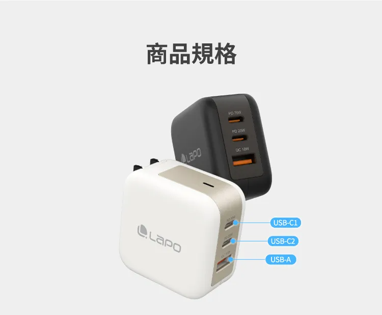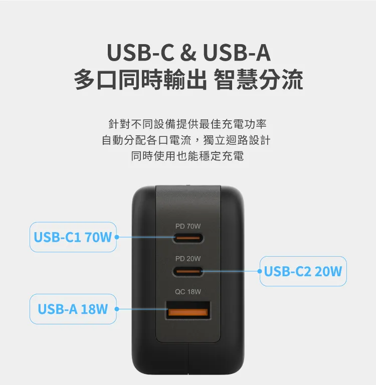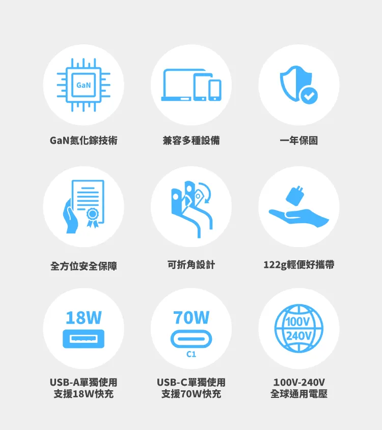 • 採用GaN氮化鎵最新第三代半導體科技,70W高功率迷你充電器